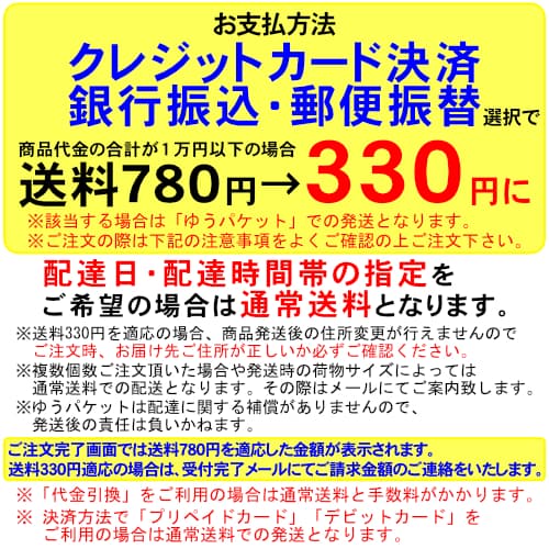 お支払方法「クレジットカード決済」「銀行振込」「郵便振替」でご注文頂くと送料330円(ゆうパケット・ポスト投函)で発送します!